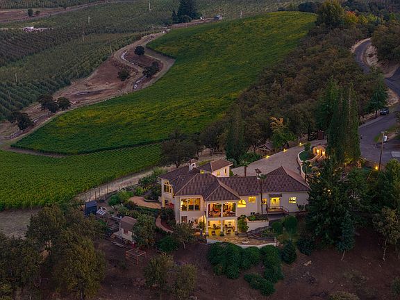 Just Listed! Amazing Northwest Santa Fe style home perched on a knoll w/forever views overlooking vineyards, valley, city lights & Mts. Paved driveway to 1.02 ac lot w/brick entrance wall w/dbl gated entry to paver courtyard w/3 car garage, stucco exterior, tile roof, palm trees & great landscaping w/night lighting + a lg water fountain. Lg front arched wood door w/covered area w/beautiful brick floors, Lg ceilings, archways niches, floor to ceiling windows to take the views! Many doors & French doors to beautiful cement patios off primary suite, great/family rm & dining rm. Downstairs 2 bdrms w/lg cement patio + a brick covered patio. Montana stone sitting area w/built-in fireplace. Amazing kitchen w/lg island, granite counters, Wolfe 6 burner gas cooktop & oversized convection oven perfect for entertaining. Beautiful primary suite, 2 walk-in closets, lg tile shower, soaking tub & French doors out to a covered patio. Many garden beds w/drip systems, greenhouse & whole house generator