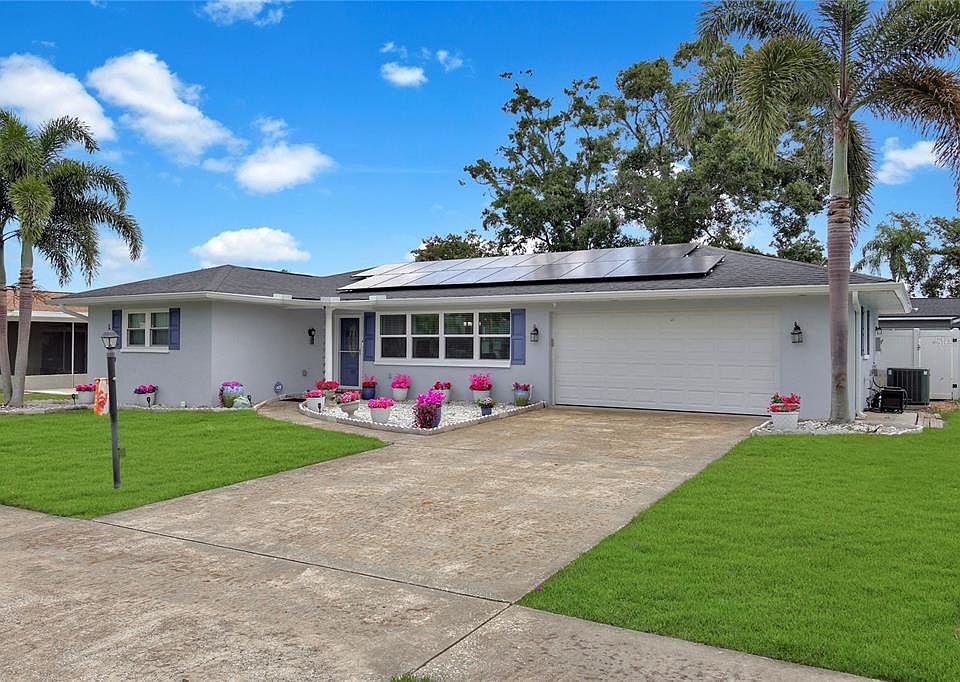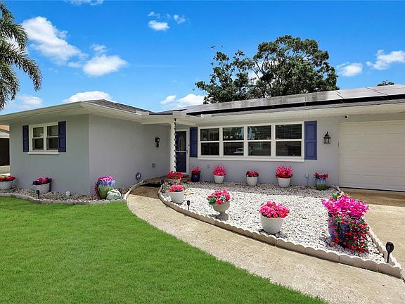 MOVE IN READY!! HANDICAPPED READY !! 2BEDROOMS, 2 BATHS HOME IN SUNSHINE ESTATES!! Fully Updated! Prime Palm Harbor location in the heart of it all! Own your piece of paradise now with this meticulously maintained one-story gem. The work has been done for you in this fantastic 2 BR + Florida Room / 2 BA, 2 Car Garage home with a salt pool AND POOL HEATER!! No HOA and owner does not pay for flood insurance currently! Approaching the property, you'll be impressed by its curb appeal, enhanced by recently installed exterior STORM WINDOWS AND NEW HURICANE WINDOWS IN THE FRONT AND NEW BLINDS IN THE FRONT!! window shutters and a newer ROOF (2018) WITH NEW GUTTERS !! Step into a welcoming open floor plan filled with abundant natural light! The UPDATED KITCHEN is a chef’s delight, featuring a spacious layout, breakfast bar, TALL CABINETS, stainless steel appliances, a tile backsplash, granite tops, AND NEW CERAMIC TILESS!! Perfect for entertaining, it opens to a family room with newer windows and recessed lighting. A cozy den leads to the Florida room through glass sliding doors, providing an indoor/outdoor feel. This room could easily be converted into another bedroom if desired! Both bedrooms boast large closets with built-in systems AND NEWER FLOORING!! Both bathrooms were UPDATED in the last few years with stylish tile, granite, and lighting THE HALL BATH HAS A NEWER INSTALLED walk-in BATHTUB!! Step outside to your oasis! The salt pool, surrounded by a pool cage and beautiful pavers, awaits your enjoyment. A newer PVC fence adds to your privacy. Additional features include newer paint (inside/out), AC (2016), a Meyer lemon tree, added gravel in the front and back, backyard sod, a concrete walk path on the side of the house, a well for the lawn irrigation system, and included washer and dryer. THE SOLAR SYSTEM IS LEASED AND THE OWNER ONLY PAYS $155.00 a MONTH. Help with the electric bill, also the owner purchased a TESLA POWER WALL 3 battery backup!!