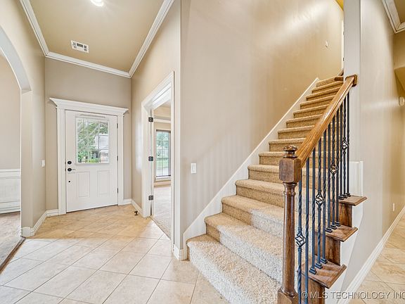 This custom built 5 bedroom is a flexible floor plan that can work for many lifestyles and life changes. Rich hardwoods and fresh paint invite you to a private office and formal dining room and flow to the open chef's kitchen that is equipped with stainless appliances, granite counters and a large center island. An abundance of custom cabinets, plenty of prep space and large pantry make this a wonderful spot for gathering with friends and family. A family room with fireplace & charming arches adjoins the space and accesses a covered patio. The first floor primary bedroom has en suite spa styled bath with separate tub and tiled shower. Two additional bedrooms on the entry level are positioned for privacy and functionality. Upstairs are 2 additional bedrooms and a cozy media space. Beautifully landscaped front and back with full irrigation and privacy fence. The large backyard with covered and open patio are perfect for outdoor living. 2.5 car garage has space for workshop or toy storage. Enjoy this vibrant neighborhood with pool, park, pond and trails that is conveniently located near the highly sought Bixby school system.