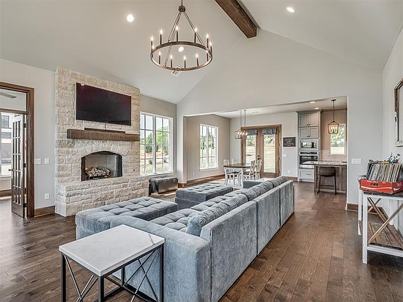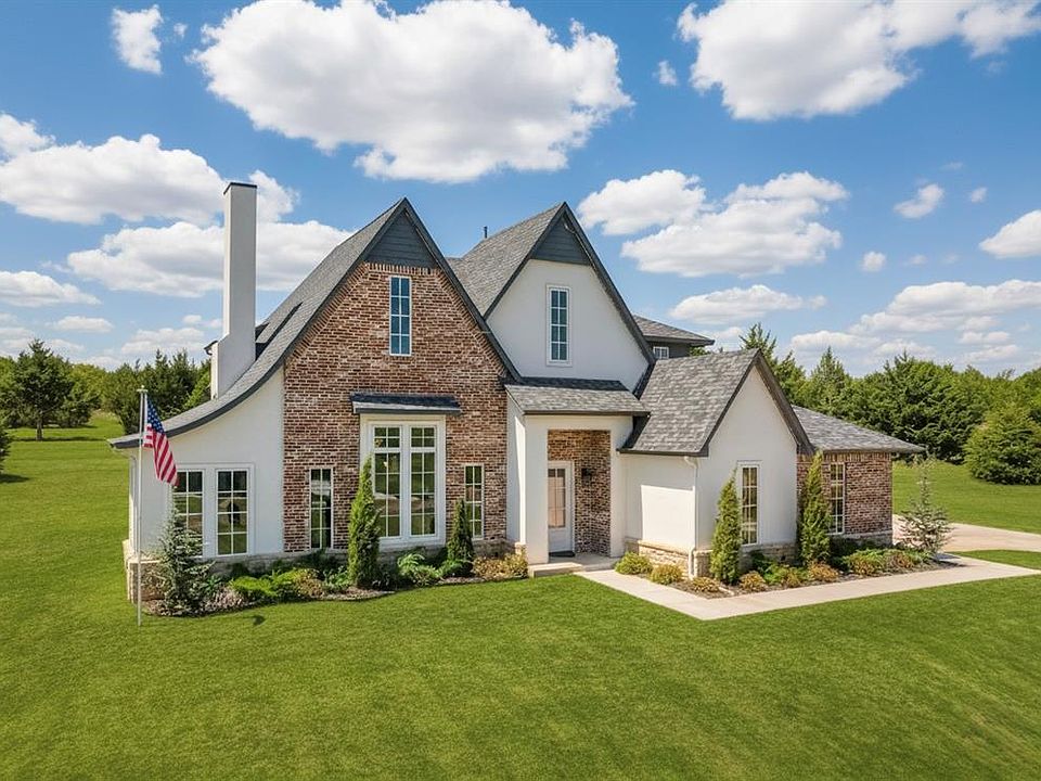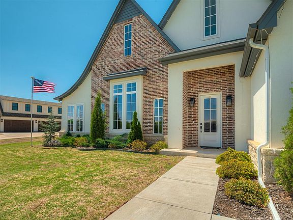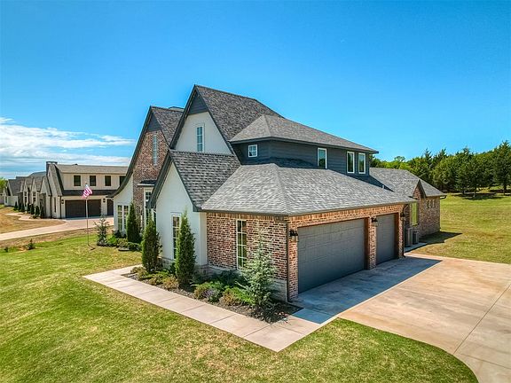Nestled in the sought-after Walnut Creek Estates , this grand English Tudor-style home sits proudly on over 1.3 acres of land. This 4-bed, 3.5-bath residence offers the perfect blend of classic charm & thoughtful design. When you arrive you will be impressed with its grand presence and timeless architectural details. You are first welcomed by a soaring entryway ceiling that sets the tone for the elegance throughout. The expansive living room features a cathedral ceiling with a rustic wood beam, rich wood flooring, striking stone fireplace, & lots of tall windows for natural light. The open-concept layout seamlessly connects the living area to the gourmet kitchen—complete with a generous island, granite countertops, stainless steel appliances, abundant cabinetry, a farmhouse sink, & a stylish coffee bar. Just off the kitchen is a spacious back pantry with its own sink, & granite counters, along with a conveniently located half bath. Retreat to the luxurious primary suite featuring a vaulted ceiling with wood beam detail & private patio access. The ensuite bath is a spa-like haven with granite countertops, a soaking tub, a tiled walk-in shower, and a large custom closet with built-ins. Through elegant French doors, the dedicated study offers a serene workspace with beautiful natural light. The 3 secondary bedrooms are well-proportioned & offer comfortable living space. Two share a stylish Jack-&-Jill bath, while the 3rd enjoys easy access to a full bath nearby—ideal for guests or family members. Step outside to the expansive back patio— the perfect spot to enjoy quiet evenings under the Oklahoma sky. The sprawling backyard is dotted with mature trees, offering just the right balance of shade & open space for outdoor fun or peaceful solitude. This home is a rare find, combining stately architecture, luxurious interiors, & room to roam. Neighborhood has a stocked pond with a picturesque fishing dock!