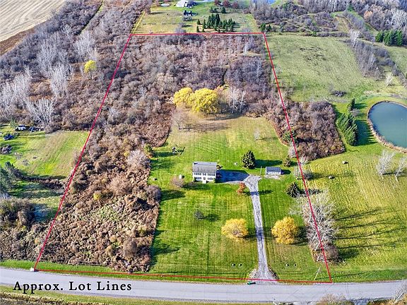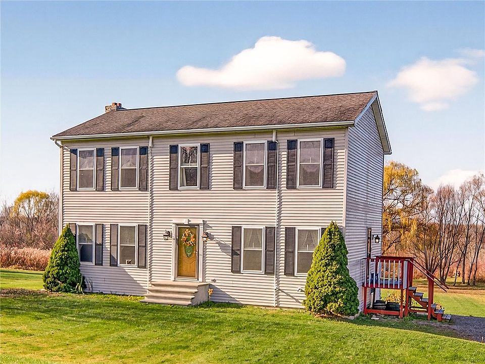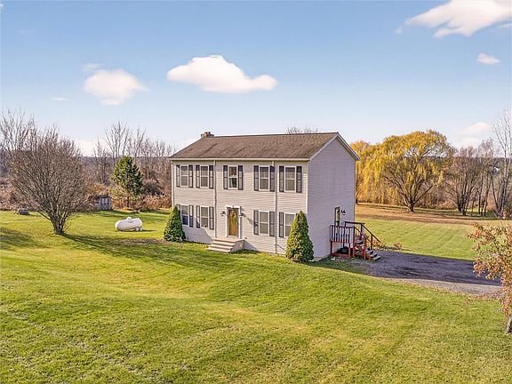 Welcome Home to this spacious 2700 Sq Ft Colonial style home nestled on a sprawling 8.26 acres. This property offers the ideal blend of classic design, updated decor & amenities, and peaceful seclusion. Upon entering through the side entry you are greeted by a spacious mud area and a convenient powder room. The kitchen has an open layout with a breakfast bar, fully applianced with newer SS oven/range, microwave, & refrigerator, plenty of cabinets. The formal dining room is ready to host your traditional favorites & special gatherings. The Great Room has large windows that allow for natural lighting, luxury laminate flooring, a mini-split unit for heating & cooling & sliders that lead to a newer Trex deck. On the 2nd floor has a spacious Primary bedroom with a walk-in closet, 2 additional bedrooms, a full bathroom with skylight, and a convenient 2nd floor laundry room. All 3 bedrooms have a mini-split unit providing personalized heating & cooling for year-round comfort. The 3/4 finished basement provides an additional 700 sq ft of versatile living space, with a rec area ideal for a media room, home gym, or play space, a Pellet stove, a powder room, & sliders that lead directly outside to a patio. Other utilities include: 200 amp electrical service, Boiler unit (2015), Tankless/On-Demand Water Heater (2yrs). The Ring Doorbell on the side entry is Active & will remain. Outside the 300 sq ft Outbuilding w/electrical service for yard tools & mowers, etc. The backyard has room to roam & a vast amount of greenspace ideal for yard games, cookouts, parties with plenty of guest parking, or just relaxing on the deck and/or patio & enjoying the scenery. Convenient location, minutes to rt 390, shopping, restaurants.