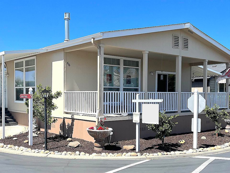 Enjoy the pinnacle of luxury manufactured home living. This home feels and lives larger due to its well thought out floor plan and expansive 9 ft ceilings. Recently re-leveled home prior to replacing most windows and painting exterior. Sunlight baths the home with light that showcases the neutral designer colors. Other designer touches include recessed lighting, tray ceilings, crown moulding, luxury vinyl and tile flooring, double height upper maple cabinetry in kitchen, marble stacked-stone gas burning fireplace, generous 30ft wide covered deck, and low maintenance landscaping! This turnkey property is steps from community pool, clubhouse, guest parking, and some of the nicest neighbors in Pleasanton. Located in park with extensive calendar of activities.