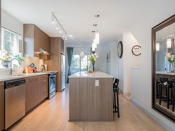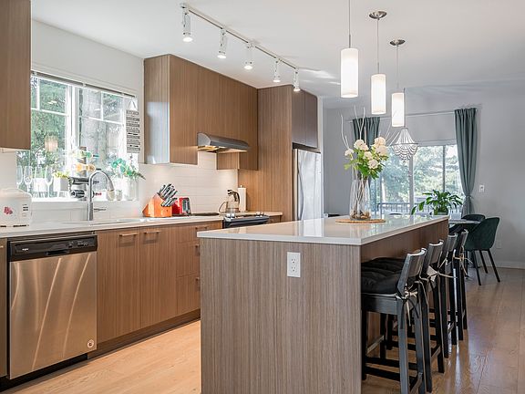 WELCOME TO ALLWOOD PLACE. This 3 bedroom, 3 bathroom townhome is an end corner unit, making it the most desirable location. The oversized yard is one of a kind with the ultimate privacy and space with tall trees that provide you with plenty of shade. There is a powder room on the main floor, large Island with quartz counter tops, built in microwave and stainless appliances. Upstairs provides a nice sized primary with walk in closet, ensuite, and an additional 2 bedrooms with main bathroom. Unit has a tandem garage with exterior exit and epoxy flooring. This complex has a gym, party room, yoga room, theatre and a play park. The perfect home for a growing family, close to stores and restaurants with visitor parking right outside.