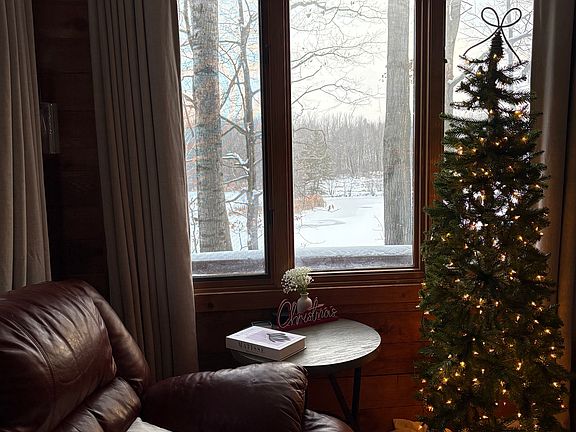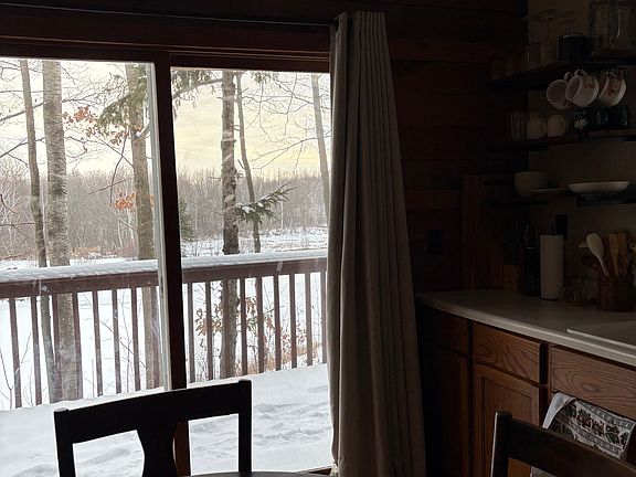 Cozy warm two bedroom cabin/home in the heart of a 160 acre property. Setting high above a small private lake/pond with amazing views from both inside the home and the deck.
