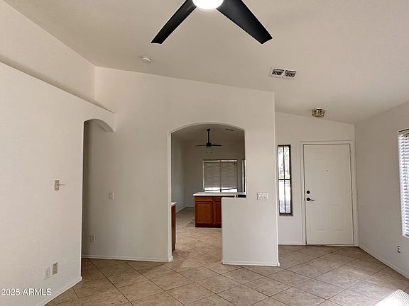 This beautiful home is close to San Tan Marketplace and Gilbert Mercy Hospital and right off Loop 202. San Tan Ranch Elementary School within walking distance. Single level 3 bedroom, 2 bathroom . This open floor plan home has vaulted ceilings, neutral paint throughout, ceiling fans in each room and tile and wood laminate flooring throughout with no carpeting. Larger open living room with vaulted ceilings and large kitchen features separate pantry, dining area, electric range, stove top microwave, dishwasher and refrigerator. Oversize primary suite with walk-in closet and attached bathroom with garden tub. Inside laundry and two car garage offer ample parking in storage. Larger backyard with covered patio, shade trees, grass area and fire pit.