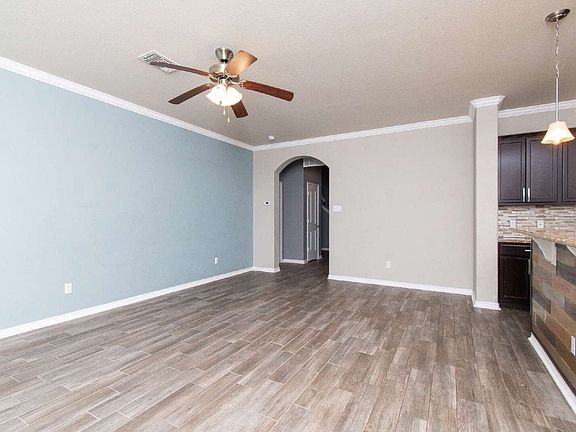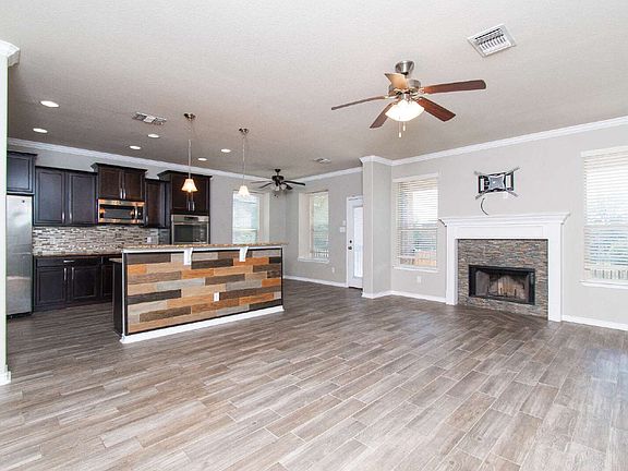 This inviting home features ceiling fans throughout and a cozy living room highlighted by a charming fireplace. The kitchen boasts granite countertops, a breakfast bar, custom cabinets, a pantry, and stainless steel appliances. Rooms are generously sized, and the primary bathroom offers a separate shower, garden tub, and double vanity for a spa-like retreat. Enjoy outdoor living in the privately fenced backyard and take advantage of the attached garage located in the front.