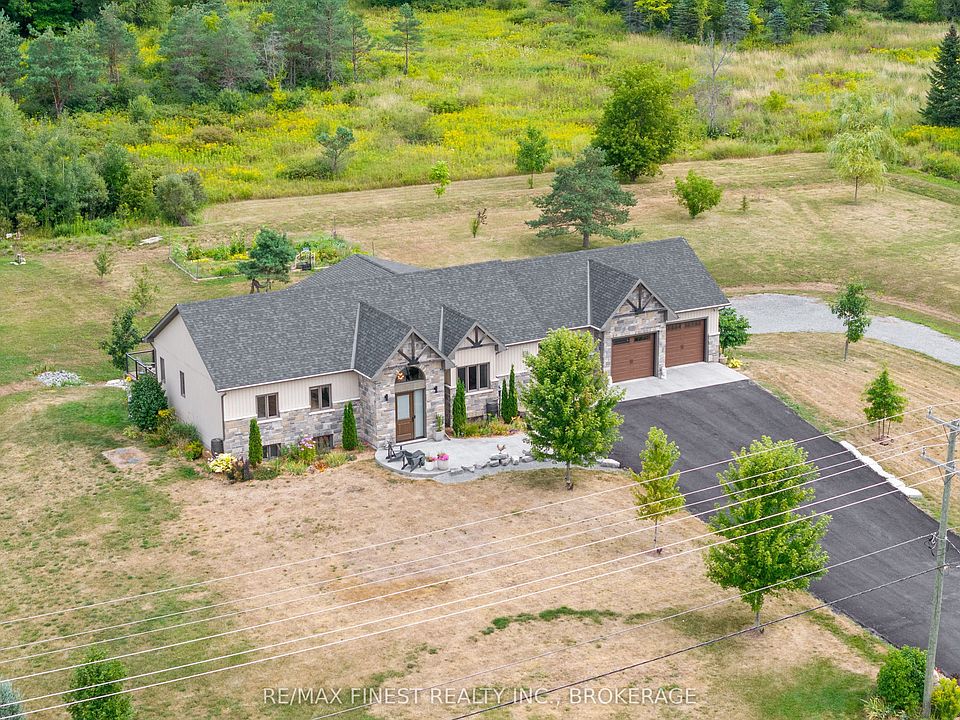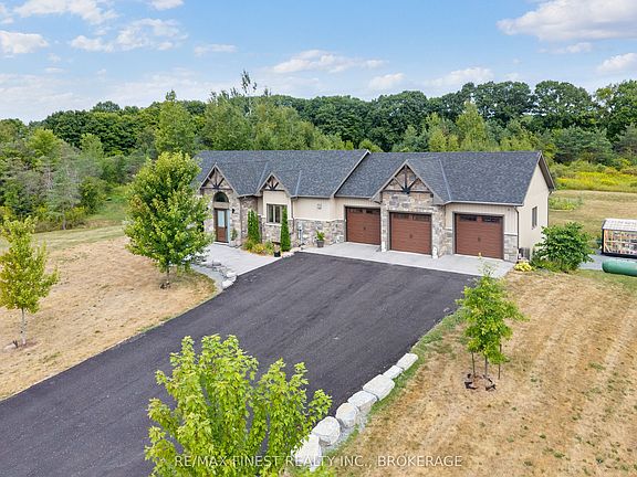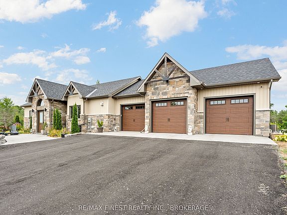 Thoughtfully designed, beautifully maintained, and upgraded throughout, this 5-year-oldbungalow offers a lifestyle as remarkable as its features. From the moment you arrive, the property's presence captivates with 3 acres of professionally landscaped grounds with trees, vibrant gardens, natural stone accents, and a 3-wide paved driveway that gracefully wraps around to the rear garage and patio. Inside, light-filled spaces blend comfort with sophistication. The open-concept main level is anchored by a stunning stone fireplace with a propane insert, creating a warm focal point in the living area. The kitchen showcases stone countertops, stainless steel appliances, and picturesque views of the private backyard. The primary suite is a retreat of its own, featuring a 4-piece ensuite with built-in vanity, walk-in closet, additional closet, and patio doors leading to a stamped-concrete balcony and an expansive 15x64' deck. A 30' section of this outdoor haven is fully covered, featuring a ceiling fan, pot lights, electrical outlets, and BBQ hookup - the perfect setting for morning coffee or evening gatherings. Two additional bedrooms and a 4-piece bath complete the main level. The lower level expands the possibilities with a large rec room, spacious bedroom, a separate den/home office, a 3-piece bathroom, generous storage, a walk-out to the yard, and direct access to the lower garage. This two-level heated garage with six bays finished in epoxy provides endless options for a home workshop, car collection, or recreational toys. A dedicated backyard bar room, with a wet bar, epoxy flooring and a roll-up glass garage door opens to the patio below the deck, offering a distinctive venue for year-round entertaining. A 20KW Generac generator ensures peace of mind in all seasons. Positioned between Harrowsmith and Sydenham, this home combines the tranquility of rural living with access to local amenities and only 20 minutes to Kingston.