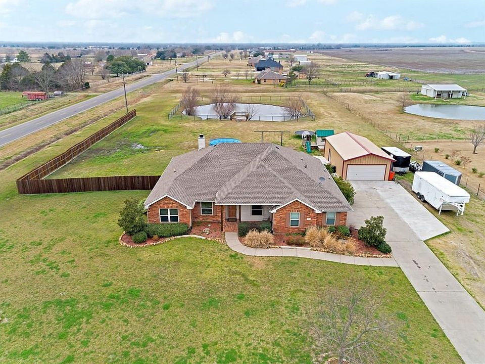 This lovely Country home is situated on 2 acres with a pond in sought after Caddo Mills ISD. Spacious open floorplan with big kitchen featuring large nook, breakfast bar with ample counter and cabinet space. Formal dining plus private study. Open living area with corner fireplace. Split master bedroom with bay windows and great master bath with garden tub and separate shower. 3 large secondary bedrooms with 2 more full bathrooms. 36x20 insulated shop with 2 doors and 220 electric. 15x12 covered patio and covered porch 15x7. Huge pond. Great location just minutes to I-30.