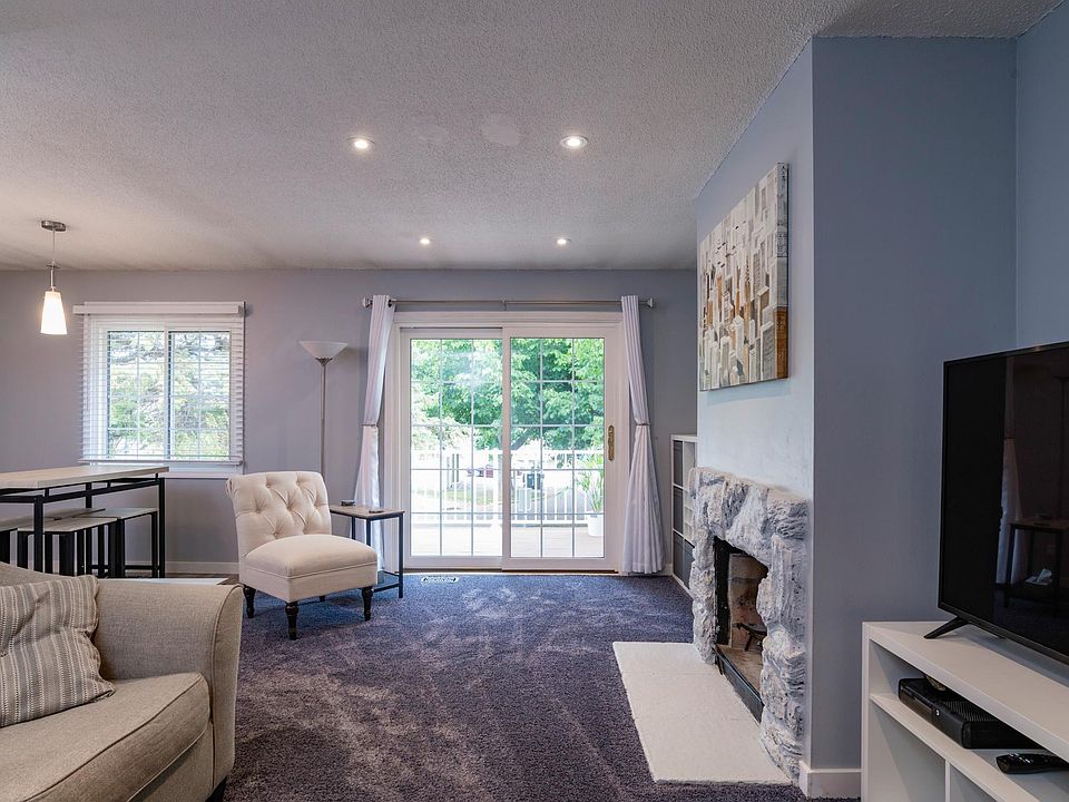 Urban loft feel in the Suburbs! Why rent when you can buy! This townhome gives you the industrial loft vibe from the open, raw wood stained steps to it’s sealed concrete and wood block kitchen counters and open shelf cabinets! Main level also has fun stone wood-burning fireplace that has been painted white to continue to vibe! Large patio doors open to a maintenance free deck allowing you to expand into outdoor living spaces on those summer evenings. Kitchen appliances are newer and include water filtration system. Bedrooms are upstairs has huge owners suite on the highest level has lofted ceilings continuing the loft vibe and boasts a walk-in closet and half bath. Bedroom 2 is huge and also has a walk-in closet. Bedroom 3 is just the right size as kids bedroom or home office. Main bathroom was updated in 2021 with new one-piece fiberglass tub and wall insert that looks like tile but ease of fiberglass cleaning! Hard stuff is taken care of with newer Furnace/AC (2021), Five-Star Bathroom Remodel (2021), Trex deck (2022), water heater/water softener (2023), dishwasher and micro. Great location with convenient guest parking and easy commuting access. This home is ready for you to move right in! Welcome Home!