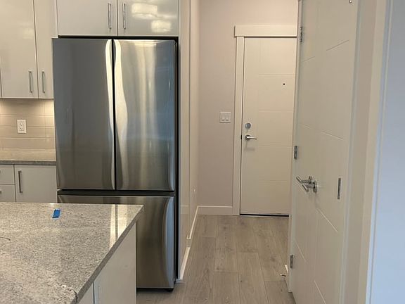 Stainless steel appliances, stone countertops, laminate flooring, open concept layout with 9 ft ceilings and large private West facing balcony.