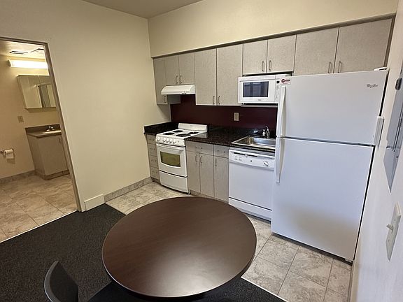 This is a one person studio apartment. It comes with a full-sized platform bed, which allows for storage underneath. The studio is equipped with an air conditioner, a couch, a dresser, and a table set. In the kitchen, you will find a dishwasher, microwave, stone countertops, and stone flooring. The bathroom includes a bathtub that has mirrored doors, a stone counter, and stone flooring. The units on the higher floors offer spectacular views of downtown Ithaca. 24/7 recorded security camera suite from ADT.