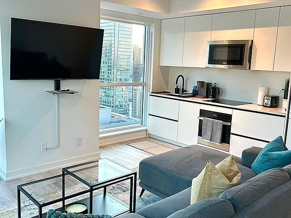 Experience elevated urban living in this brand-new, fully furnished 3-bedroom, 2-bathroomcorner suite at Empire Maverick, available for long-term or short-term lease. Spanning 1,071sqft, this upgraded unit boasts floor-to-ceiling windows, filling the space with natural light while offering unobstructed North-East views overlooking TIFF and the city skyline. Designed for comfort and sophistication, the open-concept layout features a modern kitchen with stone countertops, integrated appliances, and premium finishes throughout. The spacious living area is perfect for both relaxation and work, complemented by thoughtfully curated designer furnishings. Located in Toronto's Entertainment District, this residence offers unparalleled access to world-class dining, shopping, and cultural landmarks, including the CN Tower, Rogers Centre, and King Wests nightlife scene. With transit at your doorstep, this is the perfect home base for professionals or those seeking a luxurious urban retreat.