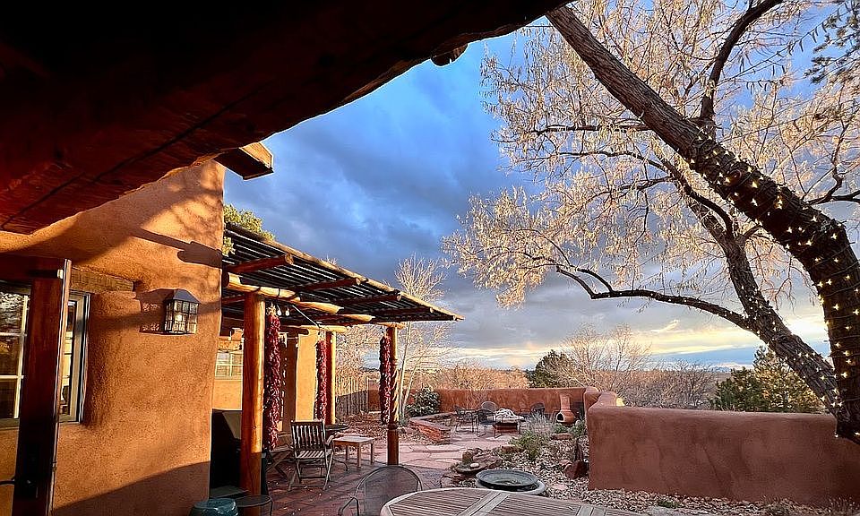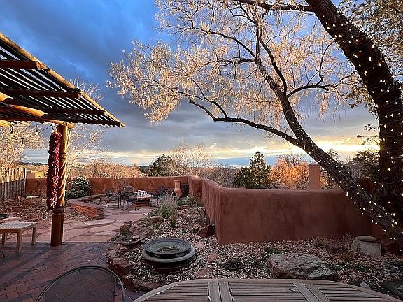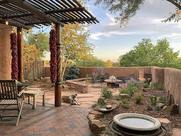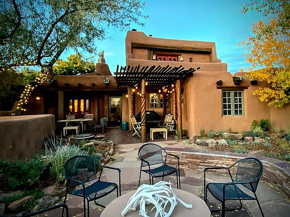 Outstanding downtown adobe with sweeping views over the city and to the mountains beyond. Rare residential living so close to the Plaza. Traditional Pueblo Revival features abound in this gorgeous home including brick floors, plastered adobe walls, kiva fireplaces, old vigas and latilla ceilings. Tasteful and very comprehensive 2016 remodel. The upper level master suite is filled with light and has a private balcony to enjoy the views and sunsets. On the first floor find a chic modern kitchen, dining room with two-way fireplace, cozy library/den, guest bedroom and office/occasional 3rd bed. New French doors access the patio with its shaded dining area, kiva fireplace, native xeric gardens, intimate sitting areas and, of course, the sundrenched views. Hard to beat such a combination of authenticity, charm, finish level and privacy in the heart of Santa Fe.