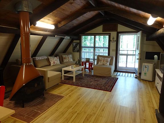 Dutch barn nestled in the National Forest within walking distance to deeded lake access(picnic area) and 3/4 +/- mile to Moody Boat ramp. Ample parking in garage for fishing boat.Deck 20X9, Kitchen/LR 36X18, Foyer 10X15. Buyer/buyer's agent to verify all information.