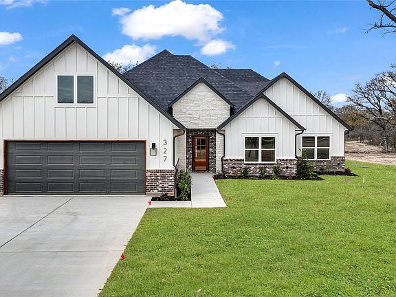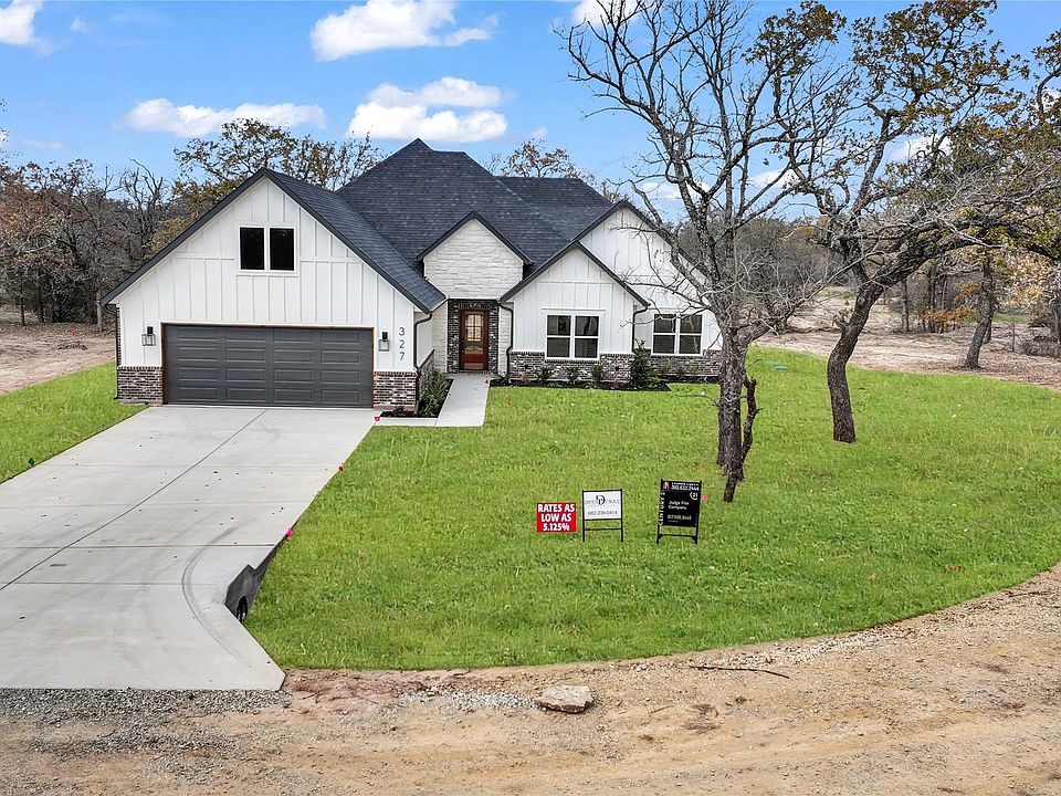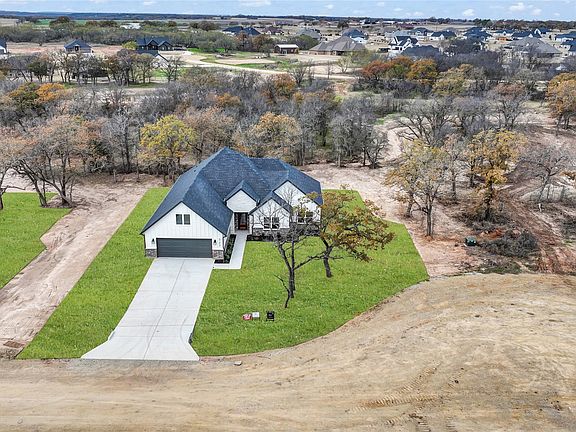 Builder offering interest rates as low as 5.125%—an incredible chance to lock in country luxury at a lower rate! Welcome to Garner Ranch in Brock ISD — where modern design meets country serenity. Set on a beautifully treed 1-acre lot, this brand-new 2,100 sq ft home offers the perfect blend of open-concept living and refined craftsmanship. Inside, soaring vaulted ceilings with striking box beams draw your eye upward, while the seamless flow between the living, dining, and kitchen spaces makes entertaining effortless. Enjoy Luxury Vinyl Plank floors throughout whole home with beautiful tile in bathrooms. The kitchen is a true showpiece, featuring a large island with quartz countertops, stainless steel appliances, and custom shaker-style cabinetry — with a rich stained knotty alder island and lowers complemented by beautifully painted uppers for contrast and warmth. A walk-in pantry and abundant storage complete the space. The spacious dining area overlooks the private backyard, where a covered patio provides the ideal spot for morning coffee or evening gatherings beneath the trees. The split-bedroom layout includes four large bedrooms, including a stunning primary suite with a tray ceiling accented by horizontal box beams and peaceful backyard views. The spa-inspired ensuite offers a soaking tub, dual sinks with quartz counters, elegant tilework, and a massive walk-in closet. Landscaping will include a full sprinkler system, lush sod, and thoughtfully selected plants to enhance the home’s welcoming curb appeal. Additional highlights include a large mudroom, full laundry room, powder bath, and a 2-car garage. Estimated completion: December 2025 — ready for its first proud owner to make it home. Crafted with care and character, this Garner Ranch gem captures the essence of upscale rural living—set on a stunning, tree-filled one-acre lot where quality construction meets everyday comfort.