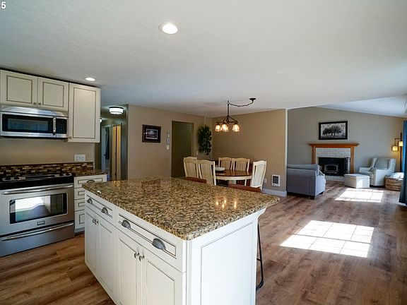 Enjoy views of Camp Creek Ridge near Thurston Hills Natural Area in this remodeled home with separation of space for houseguests and home office.With 4 bedrooms and 3 full baths (a rare option in this price range), 327 S 72nd Street features an updated kitchen and open plan for modern living. Enter the front door and step onto recently installed vinyl plank flooring. From here you are just steps from the living room, kept cozy by a Lopi woodstove. Turn right enter the bedroom hall, left access the garage (complete with large storage pantry), or up the stairs to ascend to the vaulted ceiling bonus space, suitable for family room, media center, or office space. Custom arched windows frame the Mckenzie valley with ridgline views. This top level features a private bedroom full bath - perfect for guests or extended family.Back on the main level, through the living room, you'll find the open dining room and remodeled kitchen, with granite countertops, stainless appliances, ample cabinetry, appliance garage, and sink with touch faucet and instant hot water. There's a central island for working and eating, and sliding doors to access the sunny south facing deck and back yard - fully fenced, with dining and play areas, a storage shed, and space for a chicken coop. A primary suite with full bath, two additional bedrooms, and a hall bath complete this level.The ductless HVAC system, installed in 2023, has a head in each of the main floor bedrooms and one serving the living/dining/kitchen area to keep you warm or cool, with wall heaters and ceiling fan to keep the upstairs suite comfortable. Exterior painted in 2020. The gravel pad to the left of the driveway leads to a gated and covered area perfect for storage of a boat or other oudoor vehicles and accessories.Situated just 1.7 miles to McKenzie crossing and the 126 freeway, 327 S 72nd is the perfect location for accessing city amenities, or heading east for adventures up the McKenzie.