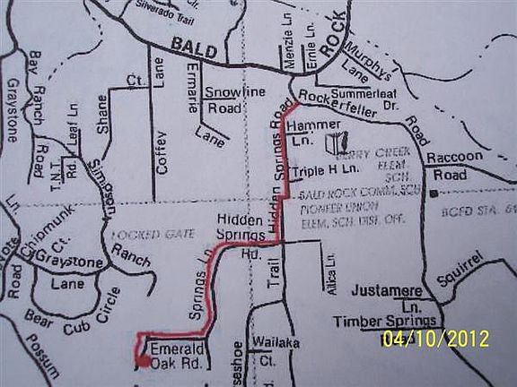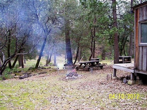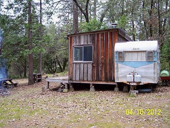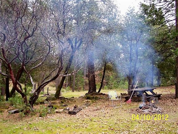 Level and gently sloping all fenced 5 acres with Tall pines, Cedars, Monstrous Manzanita with Oak Trees too. Has little 1 room shed with travel trailer.