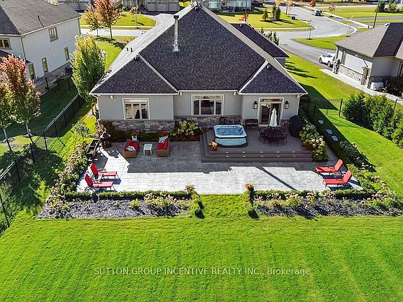 This Stunning Custom Builder Stucco/Stone Bungalow is situated on just over a half-acre private lot, offering a country feel while remaining close to city amenities. It boasts numerous upgrades from the builder and additional enhancements by the owners. Apx 5100 total square feet, finished top to bottom. The property features a gorgeous lot with a huge driveway accommodating 12+ cars (triple-wide at the garage). Inside, you'll find a 14' ceiling in the foyer, a front office/bedroom, a second bedroom, a main 4pc and a 2pc. Hardwood flooring extends throughout the main level, complemented by pot lights, O/S trim, crown molding, 9' doors, and transom windows, creating a bright yet cozy atmosphere. The large master at the rear includes a W/I and 5pc Ensuite with heated floors. The stunning great room offers an open concept design with vaulted ceilings and a floor-to-ceiling stone wood fireplace. The gourmet kitchen features a pantry, wine storage/cooler, B/I glass cupboards, an o/s island, and an o/s stainless steel fridge/freezer combo & gas stove. The DR provides a W/O to a 26x15 composite deck, 8-person hot tub, lighted stairs leading to a huge pattern concrete area-$40k, a custom shed -$25k and wrought iron fencing around the rear yard. The exterior is enhanced by mature trees and professional landscaping. The main floor also includes a laundry with a side door and a mudroom leading to a fully insulated garage with an epoxy floor and a gas heater. There is a separate staircase to the basement and a rear door. The gorgeous oak staircase leads to a spectacular Fin Basement with upgraded 9' ceilings, ideal for an in-law setup. It includes a huge R/R with a B/I projector and electric screen, a gas fpl, pot lights, and engineered hardwood t/out. There is a second kitchen with top-end appliances, two bedrooms with 4-piece ens (with heated floors), two exercise rooms (one could be a third bedroom), a utility room, a finished office, and a huge cold room.