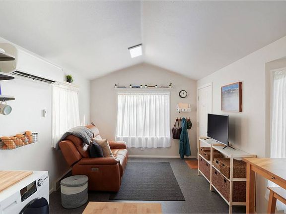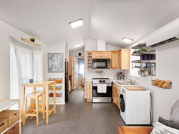 YOUR BEAUTIFUL TINY HOME IN THE WOODS Imagine waking up every day and looking out at the beautiful woods that surround you and hearing the sound of a running creek. This home shows pride of ownership, and you will fall in love with it. One bedroom, one bath, all on one floor. Hardwood kitchen cabinets, stove, and fridge stay with the home. Bathroom has full-size walk-in shower, new bathroom fixtures 2022, new toilet. You will enjoy the Ductless mini split in the home, new hot water heater, under counter water filter, washer dryer new in 2022. Outside your door you will enjoy for hours your covered deck with privacy fence great place for a BBQ and hosting guests. The space rent for this home is 725 a month and offers water, sewer, trash and large haul away. This is one-of-a-kind home and will sell very quickly !! Park offers many amenities unlike others. Clubhouse, gym, RV Storage, Playground, Off-leash dog park, Ponds, Running Creek.