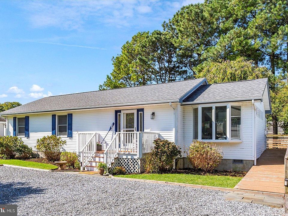 Welcome to this charming ranch-style home in the desirable Ocean Way Estates community. Offering 1,344 square feet of well-planned living space, the home features three spacious bedrooms and two full bathrooms, including a primary suite with a walk-in shower. Upon entry, the living room showcases luxury vinyl plank flooring and custom built-ins. The open-concept kitchen and dining area flow effortlessly, making everyday living and entertaining a breeze. The inviting family room, highlighted by a cozy gas fireplace and abundant natural light, extends to a spacious bi-level deck complete with a hot tub—perfect for relaxation or gathering with friends. Outdoors, the landscaped yard is enhanced by an outdoor shower, ramp access, and a storage shed, while the stone driveway ensures plenty of parking for family and guests. A brand new roof further enhances the home’s value and appeal. Ocean Way Estates offers a kayak and SUP launch on the tranquil Assawoman Canal, placing coastal recreation just steps away. Ideally situated only 1.5 miles from Bethany Beach, near the Assawoman Canal Trail, and within walking distance to local dining, this home blends comfort, convenience, and the best of coastal living!
