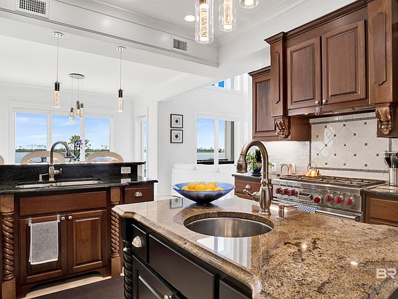 Just minutes from the Pass and white sandy beaches, this beautifully maintained stunning Ono Island waterfront property offers a plethora of amenities including a saltwater gunite infinity POOL, private dock with spacious BOATHOUSE, extensive terraces, two kitchens, two laundry rooms, five private generous bedroom suites situated in a picturesque setting with panoramic southern views of Old River, Florida's Perdido Key State Park and the Gulf of America. The main level includes a grand foyer, magnificent sunlit great room, dining room and kitchen including pantry with top-of-the-line appliances, an elegant waterfront primary suite with dual walk-in closets along with a private guest suite, powder room and laundry room. The first level features a fully self-contained waterfront one-bedroom apartment with private entrance, 13' x 9' storage including two garages (25' x 33'/29' x 10') with heavy-gauge New Age garage storage cabinetry or ascend to the third level by ELEVATOR to discover two generous private waterfront bedroom suites complete with a loft, private office space and large 18' x 19' floored attic. Nearly every space is graced with panoramic water views. Property is truly spectacular. Schedule your private viewing today and capture the spirit of the Ono Island lifestyle. Buyer to verify all information during due diligence.