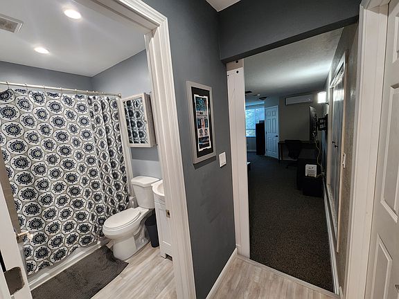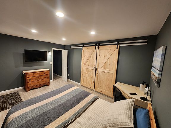 The large bedroom has new flooring and comes with a queen sized bed, desk/table, and dresser and adjoins a well-equiped kitchen with new appliances. The area also accesses a recreation room with a large TV, and sofa. New features as well include ductless mini-split, dedicated internet (very high speed) and new, in-unit, LG washtower.