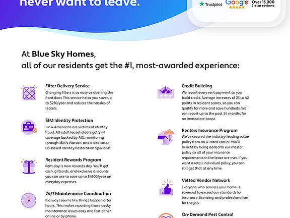 All Blue Sky Homes residents are enrolled in the Resident Benefits Package (RBP) for $59.95/month which includes liability insurance, credit building to help boost the resident's credit score with timely rent payments, up to $1M Identity Theft Protection, HVAC air filter delivery (for applicable properties), and our best-in-class resident rewards program, on-demand pest control, and much more! More details upon application.