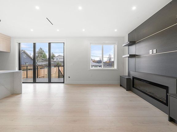 This stunning back half-duplex offers elegant design and quality construction in highly desirable Killarney, Vancouver. Featuring approx. 1,643 sq. ft. of well-planned living space, it includes a bright open-concept main floor with high ceilings, engineered hardwood, A/C and an electric fireplace. The gourmet kitchen boasts quartz countertops, premium appliances, and custom cabinetry. Upstairs features spacious bedrooms, a luxurious primary with walk-in closet, spa-like ensuite and sundeck. The lower level includes a self-contained 1-bedroom suite ideal as a mortgage helper. Additional highlights: HRV, security system, designer lighting and garage. Conveniently located close to parks, schools, shopping and transit, this home offers the best of modern urban living.