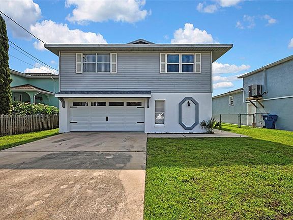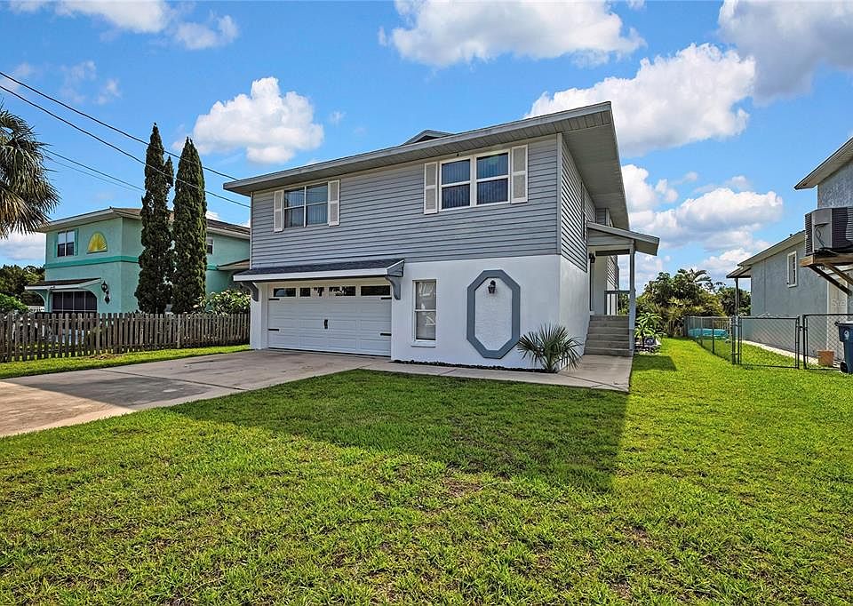 Beautiful Waterfront stilt home with seawall/knee-wall and dock. Main level offers open floor plan with plenty of natural light and views of the water. Large, Renovated Kitchen with plenty of cabinets, granite counters, Huge Center Island, space and room for barstools. Dining area flows to the Balcony offering outside dining as well as lower-level covered lanai. Back of home faces East so you can relax in the evening hours without glaring sun. Large Master Bedroom with renovated large bath. Laundry room on main level. Renovated Main Bathroom. Enclosed lower lever offering a large 2 car garage with ample storage space in addition to a room with door, window and closet.