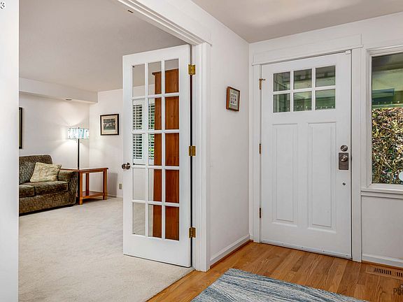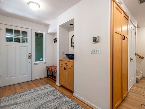 GORGEOUS PNW Contemporary in South Eugene! Lovingly maintained and nestled against wooded common area on a non-through street. Wonderful covered front porch, new stairs & decorative fencing. Beautiful front entrance opens to oak flooring from foyer through to Kitchen/Dining/Living great room featuring vaulted ceiling, skylights, granite island, high-end cabinetry, dining area, fireplace. Includes newer appliances. French doors open to Den/Office/Bedroom with built in features. Primary suite features vaulted ceilings, walk in close, primary bath with walk in shower. Private backyard borders parklike setting with gate to forest. New Trex deck is covered and ideal for entertaining or quiet morning coffee with nature!