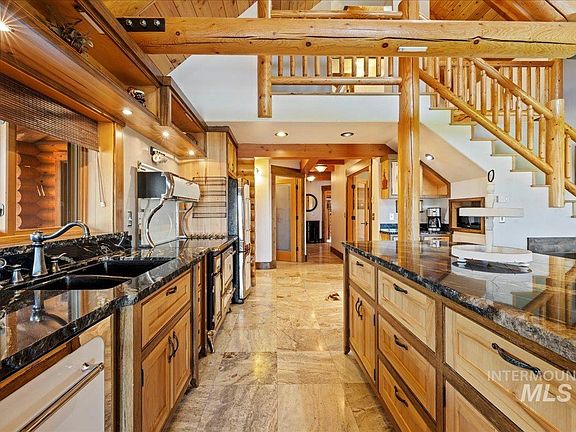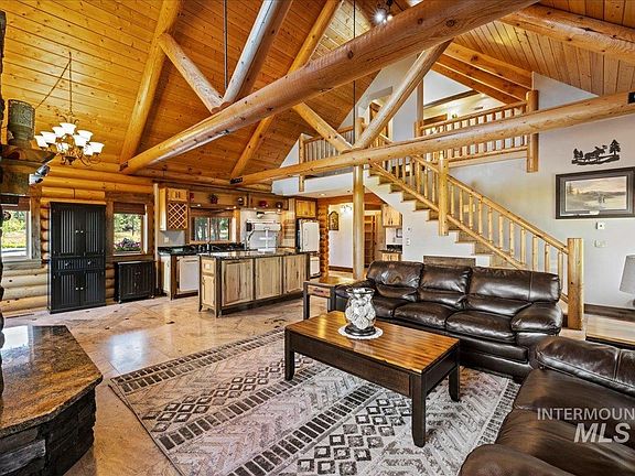 INCREDIBLY SPECIAL 5-acre property lovingly built as the owner’s dream home featuring spectacular timber beam work, hickory stairs, Peachtree windows and doors, knotty alder, fir and pine trim, cabinets with natural birch, hickory and exotic African walnut bubinga trim. The open plan highlights the kitchen rough edge slab granite island and upgraded Heartland appliances, 20’ vault with a stone lodge style propane fireplace and electric radiant heated floors of beautiful tile with inlay accents. Enjoy gorgeous sunsets on the covered decks or stroll down the river rock pathway to the yoga labyrinth or soothing sound of Goose Creek bordering the back of the property. The detached garage has a heating system and adjacent guest quarters with bathroom and shower. Recreational toys can be housed in the 14x25’ vinyl shelter. This SUPREME TREASURE is east of New Meadows and only 15-20 min from McCall, 10 min from Brundage turnout. 6/30/25 Appraisal $1,004,000. Refer to FEATURE SHEET under docs/D Tab