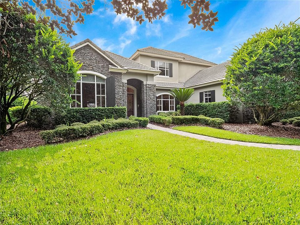 One or more photo(s) has been virtually staged. Welcome to this beautiful residence in the highly sought-after Alaqua Lakes community where thoughtful design and timeless elegance meet everyday comfort. Nestled on a private ½-acre lot with a spacious backyard, this home offers exceptional curb appeal with its inviting exterior elevation and striking stone accents. Inside, you’ll find soaring ceilings, quality finishes and generous living spaces that blend sophistication with warmth and character. At the heart of the home lies the gourmet kitchen designed to inspire both everyday living and elevated entertaining. Overlooking the family room and the bright and airy sunroom, the kitchen is a true gathering space filled with natural light and seamless functionality. Just steps away are the formal and casual dining areas, a 1,200-bottle climate-controlled wine room and a butler’s pantry making hosting effortless and stylish. A dedicated office with custom built-ins and a cozy fireplace offers the ideal setting for remote work or a quiet study. The grand primary suite, located on the first floor, serves as a private retreat with a spa-like en suite bath featuring split vanities, granite countertops, dual sinks, a whirlpool soaking tub, and two spacious walk-in closets. Upstairs there are three generously sized bedrooms and two full bathrooms that provide comfortable accommodations for family or guests along with plentiful storage throughout. Set within a premier golf course community, residents enjoy world-class amenities including clay tennis courts, a resort-style pool, a 24-hour guard-gated entrance and enhanced community security. Ideally located near Central Florida’s best attractions, upscale shopping and dining, major highways, and international airports, this exceptional home delivers a rare combination of luxury, privacy, and lifestyle.