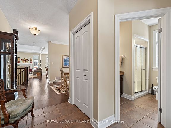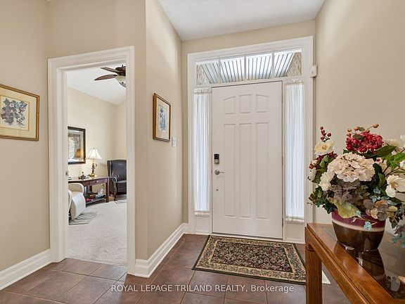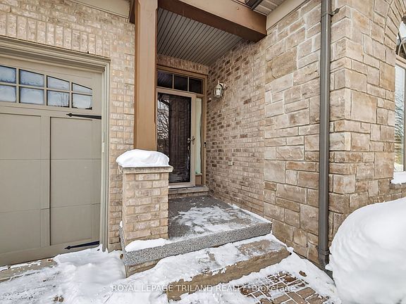 Pristine 2+2 Bed, 3 Bath, Bungalow-Style Condo Backing Onto Greenspace. Welcome to refined condo living where rich finishes, thoughtful design, and a serene natural backdrop come together beautifully. This immaculate, 2800 sq ft+ bungalow-style condo, is set within the quiet interior of the development, across from the pond and away from the hustle of Col Talbot Rd. The property offers the ease of main-floor living with the bonus of an expansive finished lower level. The sun-filled main level features an open, flowing layout with a well-defined dining area, ideal for hosting. Pristine hardwood floors shine throughout. The chef-inspired kitchen is finished with rich cabinetry, granite island countertop and generous prep space/kitchen island, seamlessly connecting to the living area. Just off the breakfast nook, step out onto a private deck overlooking tranquil greenspace. Mature landscaping provides excellent privacy while still allowing you to enjoy stunning sunset views. A new awning (2025) adds comfort and shade for outdoor dining and relaxing. The spacious primary suite offers a true retreat, complete with a walk-in closet and private ensuite. A second main-floor bedroom-perfect as a guest room, den, or home office-is conveniently located near a stylish 3-piece bathroom off the foyer, and main floor laundry. The lower level expands your living space with two additional bedrooms featuring large windows, a full4-piece bathroom, and a generous family room-perfect for movie nights, hobbies, or hosting visitors. Ample storage in the utility room adds to the home's exceptional functionality. This pristine condo delivers elegant finishes, privacy, and the convenience of one-floor living, complemented by a versatile lower level designed for every stage of life-all set against a peaceful rolling green backdrop. A/C 2025. Owned hot water heater, water softener, air exchange. Enjoy the convenience of a central vacuum, and kitchen garburator.