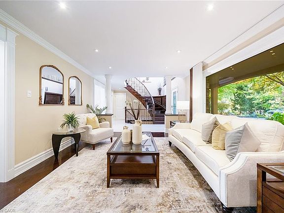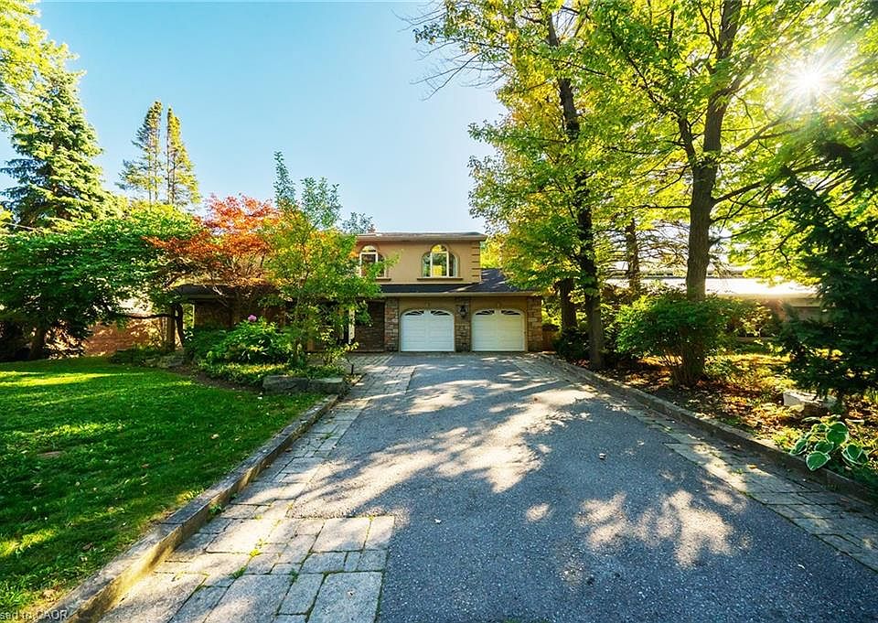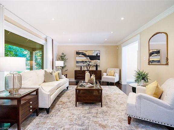 Grandly renovated 4-bedroom detached home with walkout basement on a rare 75’ x 229’ ravine lot in Mississauga’s prestigious Credit Woodlands, featuring a saltwater pool, pond, and gazebo backing directly onto the Credit River. This luxury family home is within walking distance to 222-acre Erindale Park and the scenic Culham Trail, minutes from Mississauga Golf and Country Club, and offers quick access to major highways and GO Transit for easy commuting to Toronto and Hamilton. A mature, tree-lined street leads to a deep double driveway accommodating 8 cars plus a 2-car garage. An interlocking stone walkway and covered front veranda overlook perennial gardens with sprinkler system. The backyard is a private oasis with a massive deck, covered terrace, terraced gardens, custom saltwater pool with waterfall, serene pond with sheer descent waterfall, private gazebo, and expansive green space framed by ravine views. Recent upgrades include freshly painted interior, deck and gazebo, new furnace, air conditioner, pool heater and cover, some updated main floor windows and new backyard fencing (2025), plus a newer roof. Inside, hardwood flooring, crown mouldings, pot lighting, upgraded trims, two fireplaces, and three walkouts enhance sophistication. The skylit oak staircase opens to elegant living and dining rooms, a family room with fireplace, and a chef’s kitchen with custom cabinetry, stone counters, stainless steel appliances, large island, and oversized breakfast room with walkout to deck. Upstairs, a sitting room, 2 bathrooms, and 4 spacious bedrooms are available, including a refined primary suite with a spa-like 5-piece ensuite featuring a claw-foot tub and a glass shower. The finished walkout lower level includes a recreation room with fireplace, coffered ceiling and built-ins, media/entertainment area, modern 3-piece bath, and 2 walkouts to the terrace overlooking the Credit River ravine.