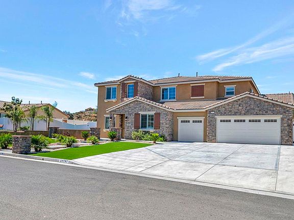 Welcome home to 32797 Hayden Road! This stunning home is located in the picturesque city of Menifee, the fastest growing City in Southern California. This home features five bedrooms and 4.5 bathrooms, a 5,220 sq ft open floor plan, and is nestled on a 139,392 sq ft (3.2 acres) lot. It offers a perfect oasis for family living and entertaining. There's an expansive driveway and an attached 4-car tandem garage, which provides eight uncovered parking spaces for 12 cars and additional RV parking. The beautifully landscaped front yard enhances the home's curb appeal. The open-concept layout is perfect for entertaining. The living room boasts a double-sided fireplace, high ceilings, LED lighting, and a chef’s gourmet kitchen featuring white shaker cabinets and quartz countertops, an oversized island, and stainless-steel appliances. The kitchen offers ample cabinet storage and an endless open-shelved, sizeable walk-in pantry. The open entryway welcomes you to an office, a half bathroom, a dining room, and a family room. On the main level, a private ensuite bedroom is excellent for in-laws or guests. Central heating and air conditioning, a Quiet Cool whole house fan system, and custom-made white shutters throughout the home. There’s a main suite and master bath with two walk-in closets, dual vanities, a luxurious freestanding soaking tub, and a standalone shower. Two secondary bedrooms with a shared full bath and a 5th bedroom, hall bathroom, and laundry room located on the second floor. Wall-to-wall sliding doors lead to a custom-built backyard, creating a seamless indoor-outdoor flow. The backyard is a fantasy, with a generous covered patio space, custom-built outdoor kitchen sink, refrigerator, built-in grill, and storage. The heated saltwater pool includes a waterfall and jacuzzi, and the attached 18-inch-deep wading pool adds a delightful touch. Additionally, the backyard features a private basketball court, a home gym, and two substantial custom-built storage sheds within the fenced yard. This dream home truly offers a resort-like experience, making you never want to leave! The property line extends the green markers. Easy to show, with one hour's notice.