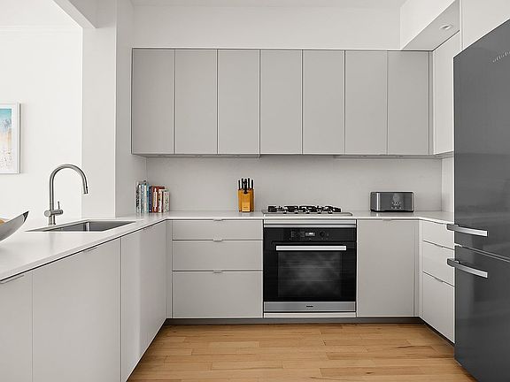 Enter through a private keyed elevator into the foyer with a large coat closet and stylish built-ins alongside the secondary egress. High ceilings, new central air conditioning and heating, natural hardwood floors, an in-unit LG washer/dryer, private outdoor space, and abundant storage all make this turnkey home a true gem. Perfectly proportioned, the open living and dining area flows seamlessly into the newly renovated sleek kitchen featuring Miralis cabinets, Silestone quartz countertops, and Miele appliances. A Juliet balcony compliments the living room overlooking tree-lined Bergen Street. Down the hallway past a pantry closet, two full bathrooms with ample storage feature Porcelanosa tiles, floating vanities, Grohe, Kohler, and Moen fixtures with Toto toilets. Two quiet and secluded bedrooms enjoy southern light and garden views. The primary bedroom features its own balcony for morning coffee and boasts a customized walk-in closet. The third bedroom located at the front of the home, is currently utilized as a home office and has custom-added storage. A deeded storage room located in the basement transfers with the sale.