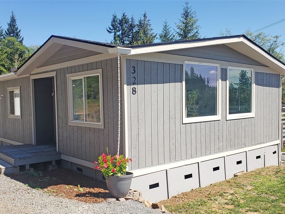 Newly refurbished manufactured home on 2 acres. Much upgrading done from the roof, to the foundation. Full new heatpump & forced air furnace system. Upgraded vinyl windows, solid new subfloor structure and durable vinyl plank flooring thru-out. Concrete runners/tiedown system, new floor insulation. Newly redone garage. Nice exterior deck. Refurb is nearly complete with only the decor' tiled bathrooms yet to be finished. Target completion date is August 30th. Set on a bit of a hill overlooking the Valley to the SE.