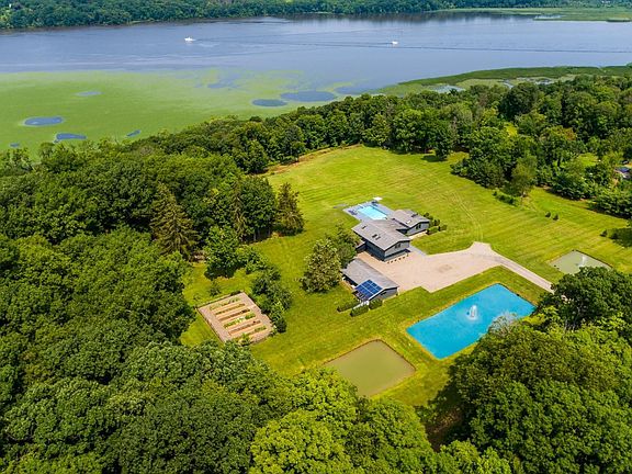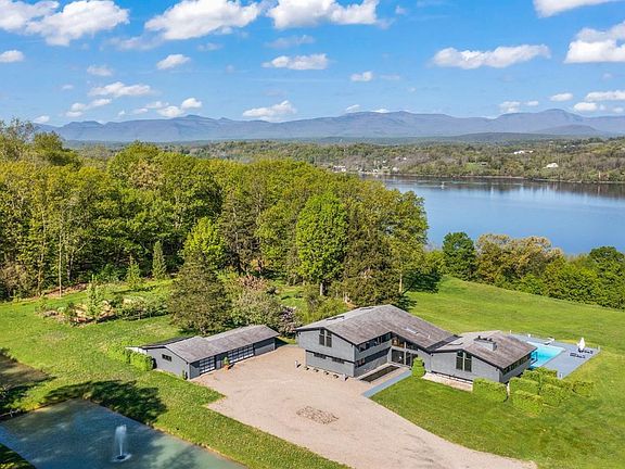 This stunning contemporary home sits of 15.6 private acres with jaw-dropping views of the Hudson River. The property has been completely and meticulously transformed by its current owners to fit seamlessly into the landscape. Entering the gates and passing the ponds, it is clear that this is an oasis of calm and tranquility. Touring the property you learn about its systems and sustainability. In addition to the home you will take in the rivers beauty, rolling grounds, terraced entertaining areas, a cantilevered viewing deck perched on the river, large in-ground heated salt water diving pool, designed flower/vegetable gardens, and gated with 10 acres fenced for privacy. The home itself boasts an open floor plan with high ceilings in the living room and double sided fireplace. Mountain and river views from the oversized plate glass windows and doors throughout the property. The current four bedrooms with three and a half baths easily converts into six bedrooms. This Smart Home is completely turn key and includes mechanical and technical elements that far exceed expectations. With a touch of a home panel or phone you can control temperature, lights, gates, fountains, security cameras, and speakers. There is also a triple water treatment system, high efficiency climate control system, partial solar power, and dedicated well for outdoor watering systems. Large Chef's kitchen with Subzero and Miele appliances with indoor and screened dining areas. Three car garage, and service providers for grounds maintenance and home services are established. Complete privacy on beautiful Mount Merino river property with large acreage rarely comes available. Eight minutes from Downtown Hudson, Amtrak Station and Catskills.