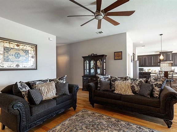 MOTIVATED SELLER! BRING ALL OFFERS. This 4bed 2 bath home, exudes warmth and comfort from the moment you step inside. The kitchen is a haven for culinary enthusiasts, boasting not one, but two islands providing ample space for meal preparation. The home has been thoughtfully upgraded with stunning solid hardwood flooring, sliding glass doors leading to an extended covered patio, and charming touches like shiplap and custom backsplash in the kitchen. Barn doors add character and privacy, leading to both the master bath and the secondary bedrooms and bath wing. A focal point of the living space is the stone fireplace. The split bedroom layout ensures privacy for all family members. Convenience is key in this location, with a fabulous pool and playground just a short walk away. Shopping and dining attractions like Eagle Mountain Lake and the Fort Worth Stockyards are within minutes. This home offers an open floor plan that invites relaxation and easy access.