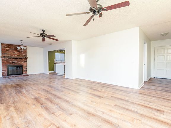 3 bed, 2 bath home awaiting new owners! Welcoming family room beyond the front entry provides updated laminate flooring, great natural light, lighted ceiling fans, beautiful brick fireplace & back patio access.The updated kitchen overlooks the family/dining room and provides white cabinetry, butcher block countertops, tiled walls/backsplash, double ovens, great pantry space, recessed lighting & an island w/ additional storage. Inviting primary w/ recess lighting & updated ensuite w/ beautiful tile shower. Both guest bedrooms are nicely sized & also provide updated laminate flooring, recessed lighting and ample closet space. The spacious backyard features covered patio space, fire pit, raised flower bed, block wall surround & plenty of space to make your own. The home also provides AC & dual pane windows throughout.