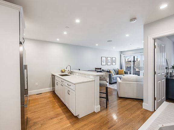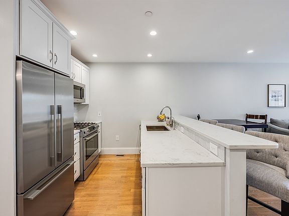 This stunning 2-bedroom, 2-bath condo spans 902 sq ft with an efficient layout all on one level. The chef's kitchen features quartz countertops, a Bosch appliance package, and a peninsula spacious enough for several barstools. Natural light fills this second-floor unit through multiple windows, enhancing the inviting atmosphere. Step outside to your private deck, complete with a gas line for grilling—perfect for outdoor gatherings. Both oversized bedrooms can comfortably accommodate a king-size bed. The primary bedroom includes a large walk-in closet and an en-suite bathroom.Additional features include an in-unit washer and dryer, central AC, a smart lock home system, exclusive use storage unit and a deeded parking spot in a heated garage with an EV charger. Built in 2016, this well-maintained home is part of a two-unit homeowners association with a healthy reserve pool. Located in vibrant South Boston, you’re moments away from everything that West Broadway has to offer.