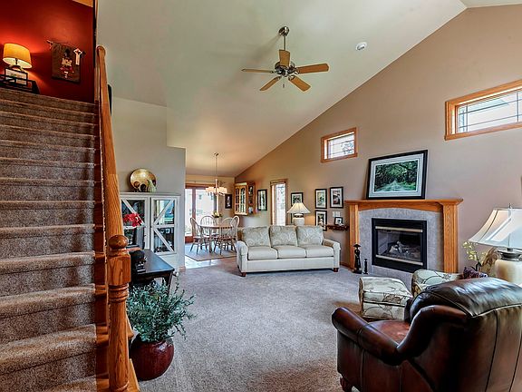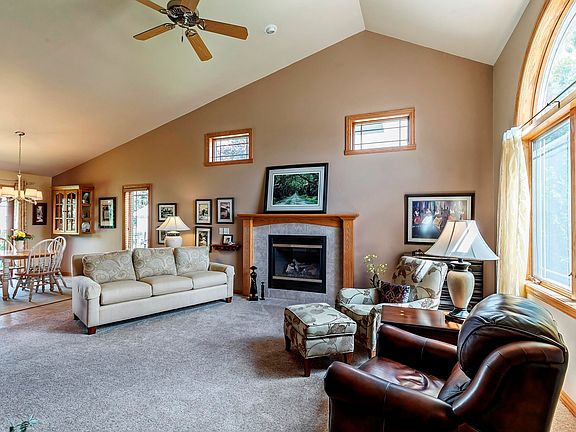 Enter the foyer and catch a view of this beautiful open concept with vaulted ceilings. A lovely staircase leads to the loft. Large front windows and transom windows above the gas fireplace lend plenty of natural light to the carpeted living area. Details such as plant ledges, open shelving, and patio doors leading to the back yard give the dining area charm. Ceramic tile in kitchen and dining. The kitchen has custom oak cabinetry with raised panel doors, pantry, recessed lighting, and plenty of counter space. White appliances included- oven w/ gas range, refrigerator, microwave, and dishwasher. Shelving could be removed from under the peninsula to allow for seating. A half bath and a nice size laundry room are not far off the kitchen. The large first floor master bedroom boasts a walk-in closet, plenty of space for a king bed and more furniture, built in shelving, ceiling fan, and a private full bath with walk in shower. Upstairs there are 3 nice size bedrooms, a full bath with tub, and bonus room with skylights. 6 panel doors and oak trim throughout. An attached, insulated 3.5 stall garage with workshop and a beautiful yard with mature landscaping complete your new dream home.