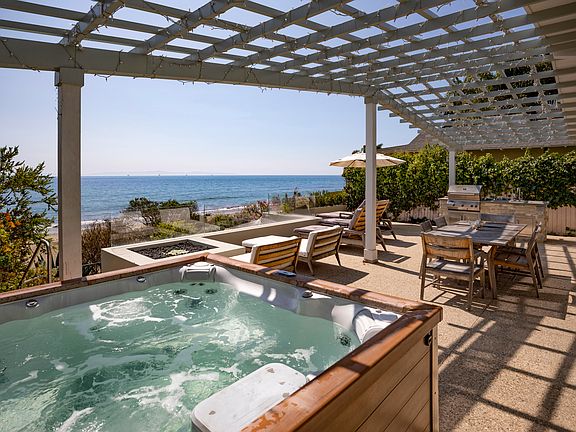 Commanding panoramic ocean, island & coastline views are enjoyed from this premier location on Padaro's coveted knoll w/easy beach access yet total privacy & safety from wave damage. The vast & private seaside patio has a fire pit, spa and built-in BBQ. Rebuilt appx. 8 yrs ago, this architecturally striking Contemp. home features herringbone teak floors with hydroponic heating, open beam ceilings and wood walls, a fabulous Great Room with stone fireplace, den/media room, open kitchen with ocean view island, wine frig & bar. Upstairs is all primary suite, with a fireplace, office, A/C and private balcony with dazzling ocean views. The flexible floorplan allows for an attached 1 bedroom guest house. Please visit https://paradiseonpadaro.com/unbranded/