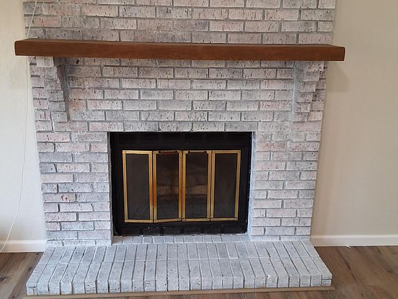 Stylish living spacePrivate patioQuartz topDeep farmhouse sinkGranite countertopsHigh ceilingsStunning brick fireplace