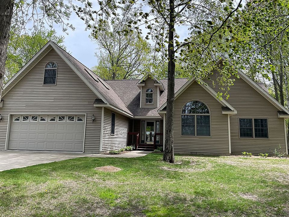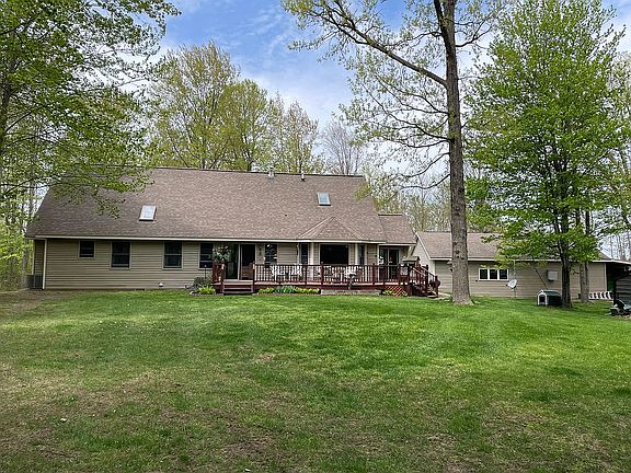 Custom built home located on 2.5 acres surrounded by woods. 4 bedrooms, 2 1/2 baths, Main floor master bedroom with cathedral ceiling, skylight, walk in closet, and large bathroom with Koehler jetted tub. Andersen windows. Living room has 19 foot cathedral ceiling and custom crown molding with a beautiful gas Lennox fireplace. Study/bedroom with cathedral ceiling and pleasant view through the the arched window. Custom built cabinets throughout. Large family room upstairs with 2 skylights. 16x16 guest room upstairs with skylight. First floor laundry. Large deck for sitting and watching the wildlife. Wood master Outdoor wood burner can be used for heating the house, hot water and the 30x42 insulated stick built workshop garage. Outbuilding has loft storage.