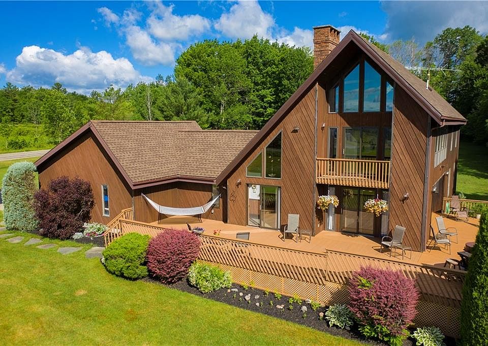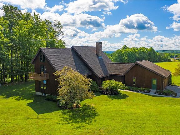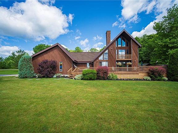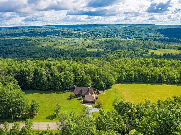 Enjoy quiet country living in this original owner, custom built 3 bedroom, 2 bath home located on 34 acres 10 minutes away from Jamestown, Falconer and Bemus. The first and second floors provide 2,600 square feet of living space, and the full basement adds another 1,024 square feet of finished living space. The first floor includes 2 bedrooms, a full bathroom, along with first floor laundry. The master suite is located on the second floor, along with a spacious living room loft overlooking the kitchen. The master bedroom and living room feature vaulted ceilings and beautiful windows with views of the surrounding property, as well as sliding glass doors leading to upper level balconies. Both the living room and the finished basement areas feature wood burning fireplaces. Updates in the last six years include a new boiler, with in-floor radiant heat in the first floor living spaces. Wood flooring, a roof and multiple windows have also been updated. Outdoor enthusiasts will enjoy wildlife and the nearby snowmobile trail system. Come see this beautifully built home inside and out with a large deck and hot tub, and views of the surrounding private, wooded property.