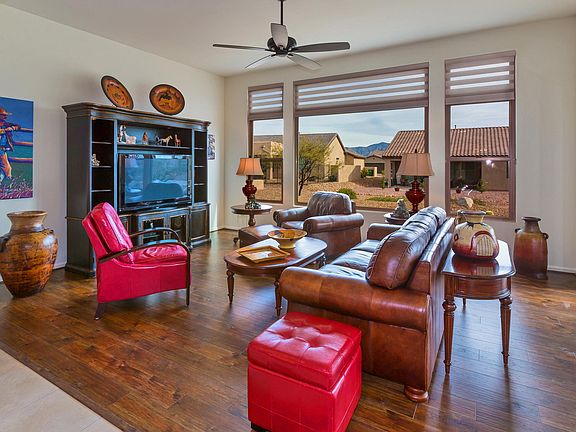 Move right in to this popular Fresco model! Built in 2017, this beautiful home is nearly new. A wide covered patio looks out on some nice mountain views, great for relaxing or entertaining!*Beautiful window coverings, Plantation Shutters*Ceiling Fans throughout*Granite countertops in Kitchen*Stainless appliances*Under cabinet lighting*Base cabinet pull out shelves*Large kitchen pantry closet*Pull out recycle and trash containers*Elegant dark wood grain floors in Great Room & Den*Large Laundry*Utility tub in garage*Golf cart garage*Water softener*Plus wonderful resort-style amenities such as large outdoor pool with lap lanes and beach entrance, indoor lap pool, spa, on site restaurant, tennis and pickle ball courts, dog park, and much more!