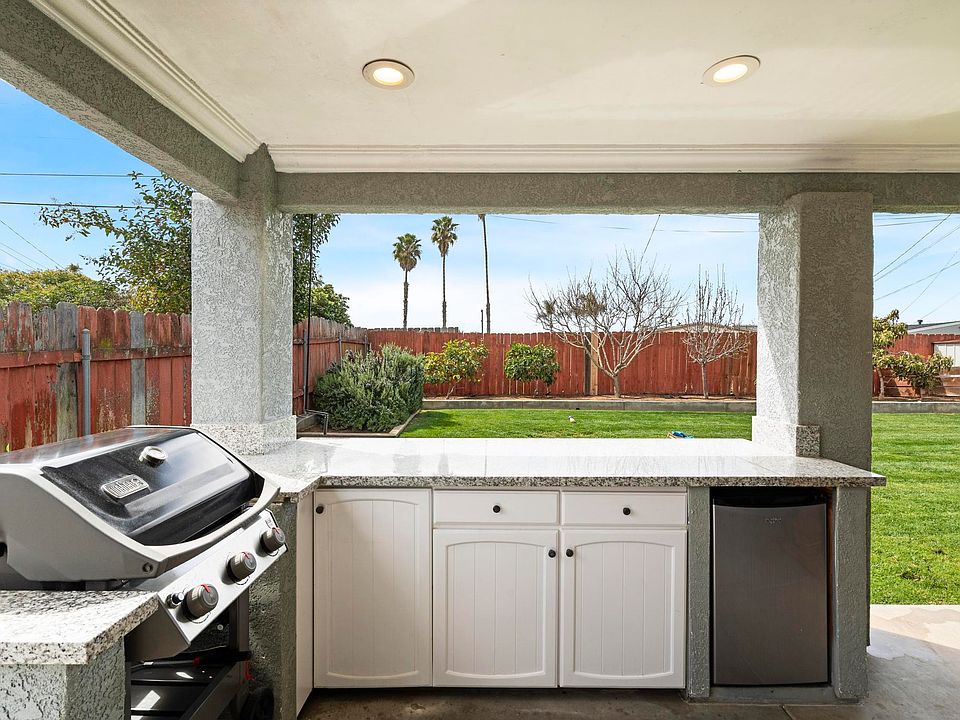 The floor plan brings in a ton of natural light and offers a very functional 4 bedrooms, 2.5 bathrooms, private laundry room with full size washer and dryer, living room, and great room opening to a huge "California room" with natural gas grill and mini fridge grilling island and lush back yard with tons of grass, gardening, and fruit trees including avocado, peaches, pears, lemons, and tangelos.