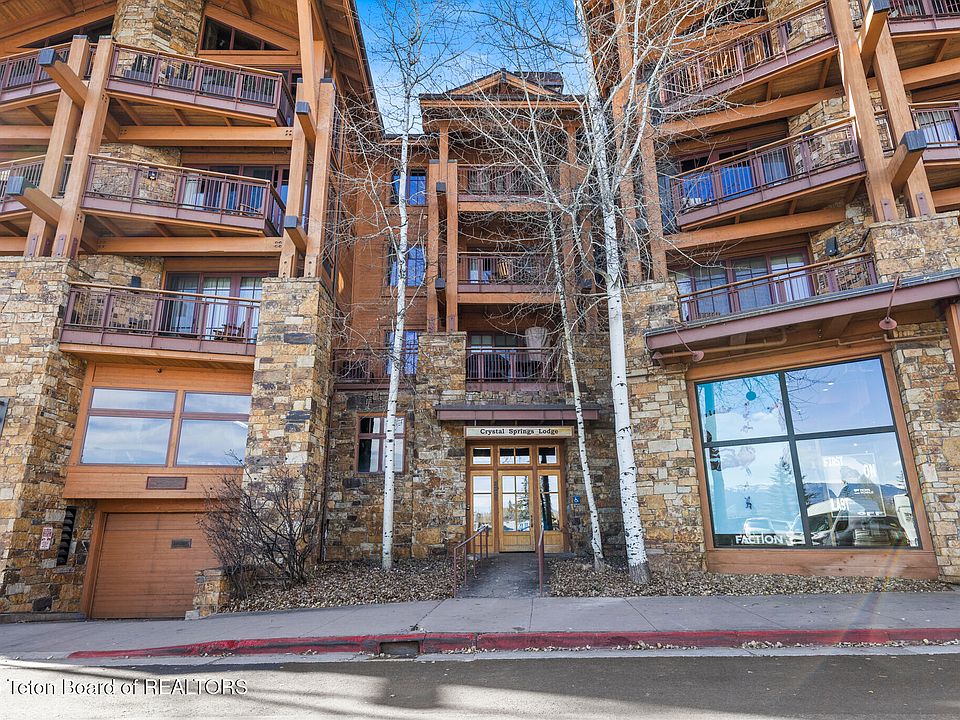Experience slope-side luxury in Teton Village. Crystal Springs #304 is one of only 18 residential units in this exclusive building, facing the mountain with views over the Village Commons—home to summer concerts and winter ice skating. The kitchen offers granite countertops, new appliances, and a high-top bar for dining. Refinished wood floors extend through the kitchen, dining, and living areas. Steps from the Jackson Hole Tram, this slope-side condo includes heated underground parking, a ski locker, and strong rental history.