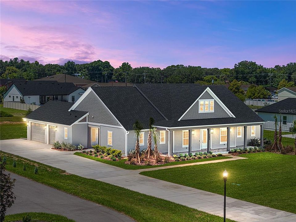 The epitome of luxurious and fully custom new construction, this expansive 5 bedroom, 3.5 bath, 3 car garage home rests on over 3/4 of an acre in the desirable town of San Antonio. A host of extra features and carefully sourced materials were added to this property to set it apart from the standard newly built home. A fresh Florida landscape, an extended drive, a covered front porch, and James Hardie board and batten and beaded lap siding with a wood grain finish create a stunning curb appeal and a warm welcome to the home. Step inside to a 20x23 living space featuring triple sliding doors to the back porch, soaring 12 ft ceilings, and open views to the custom two-toned kitchen with unparalleled finishes and an elegant design. This chef’s kitchen offers quartzite countertops, custom soft close cabinetry with a fluted central island, stainless steel LG appliances, a stylish backsplash, a custom range hood with a pot filler over the cooktop, breakfast bar seating, pendant lighting, and a large walk-in pantry with custom shelving. Beautiful Hickory wood flooring runs throughout the home, with the exception of high-end tile in all bathrooms. Custom window casings, oversized baseboards, 10’ ceilings, and custom cabinetry throughout the home, including all walk-in closets, add to the lavish presentation. The primary wing encompasses the spacious sleeping quarters, the oversized laundry room, 2 large walk-in closets, and the grand ensuite bathroom. This is not your average ensuite bathroom; comfort and luxury exude in this space with the custom cabinetry surrounding 2 separate sinks, the mosaic tile accent wall behind the freestanding soaking tub, and the walk-through shower featuring 2 shower heads, marble tile flooring, and porcelain tile walls. Bedrooms 2 and 3 are generously sized; each has a walk-in closet, and they share a full ensuite bathroom in between. Bedroom 4 is located near the front of the home. It has a double-door entry, a second entry, and a walk-in closet, which could make it very suitable as an office! The 5th bedroom is secluded from the others and offers a private, full ensuite bathroom with marble mosaic tile work, and a walk-in closet. A half bath for guests, a mudroom with a built-in dog wash and hall tree, a 3 car garage with a universal EV charging outlet, attic storage, an 80-gallon water heater, an irrigation system, and a covered back porch plumbed for a kitchen and wired for a TV add convenience and additional value for this home’s first owners! Close to downtown shopping and restaurants, the Mirada Lagoon, and major highways, San Antonio is a beautiful and growing city. Call us today to learn more about this luxury custom home!